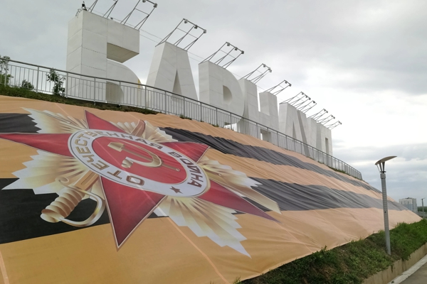 Георгиевская лента с орденом Отечественной войны 1941-1945 годов изготовлена на баннерной сетке размером 9х60 метров, а для надежности полотнище закрепили по всему периметру, через каждые 25 сантиметров. По решению главы Барнаула Вячеслава Франка, необычная для города конструкция останется у подножия на весь Победный май.